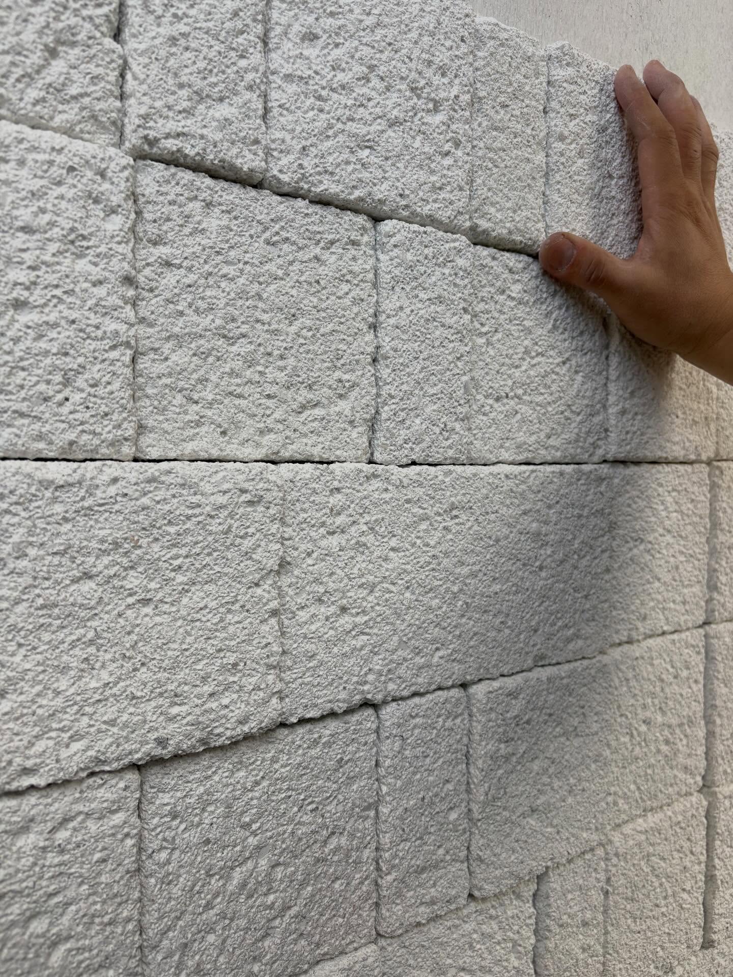 大きさと厚みを変えた数種類のブロックを、1枚1枚搔き落としタイルとして作成し、積上げることで1枚の壁を造る仕上げです。